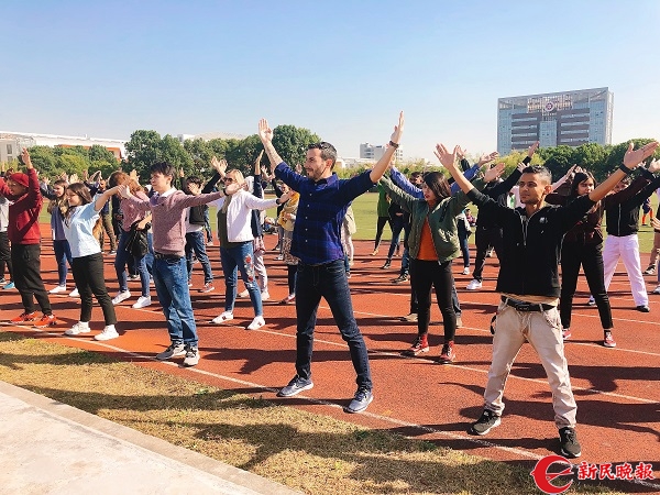 图说:留学生们在bat365中文官方网站操场上学习养生功法 新民晚报记者 左妍摄
