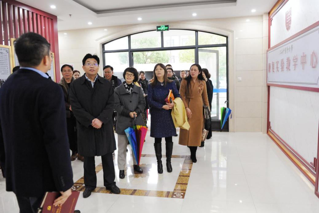 曹锡康一行实地考察康复实验教学示范中心、学生宿舍、食堂等地,对大学惠南校区建设成果表示肯定。