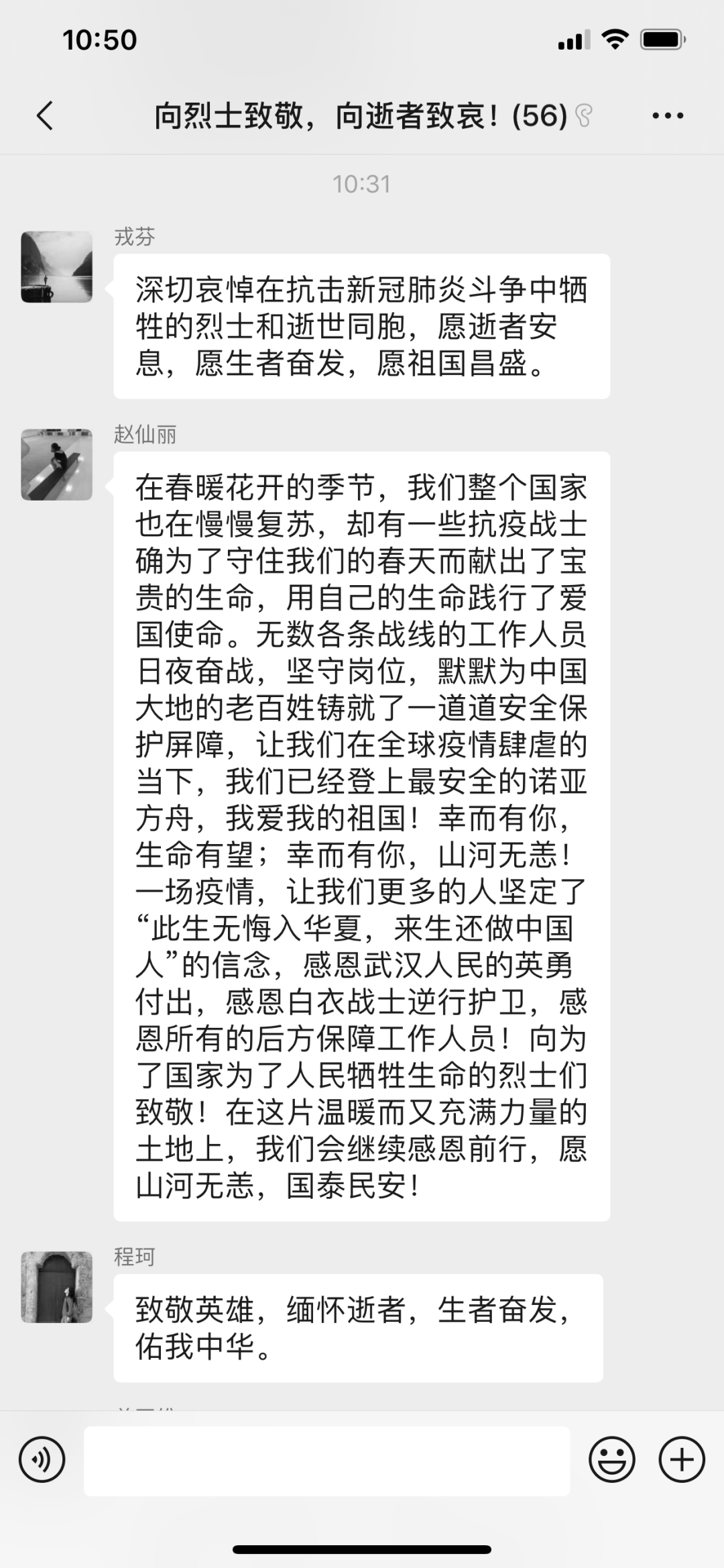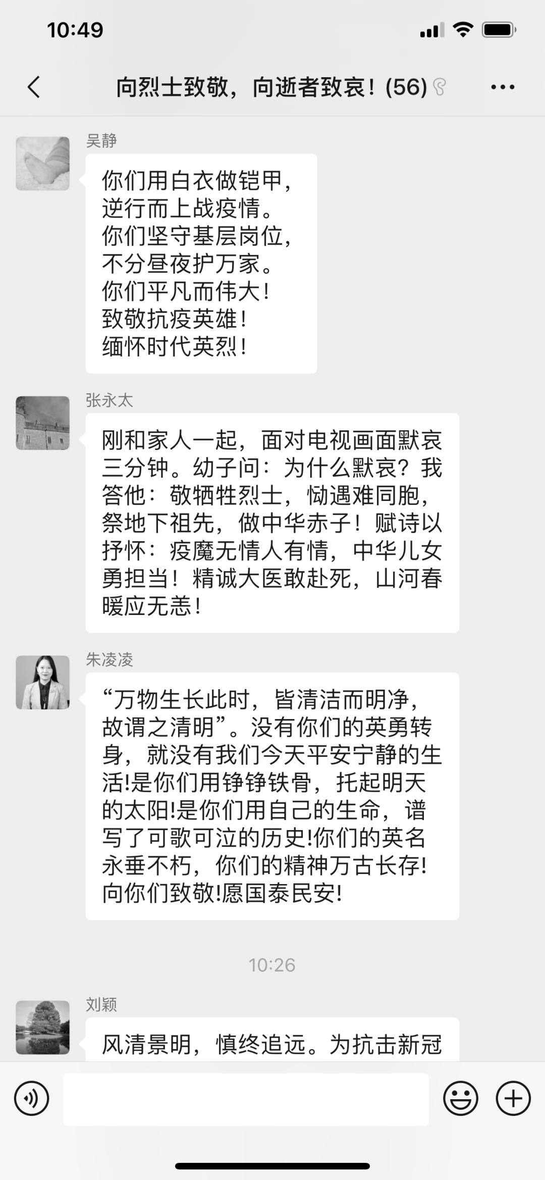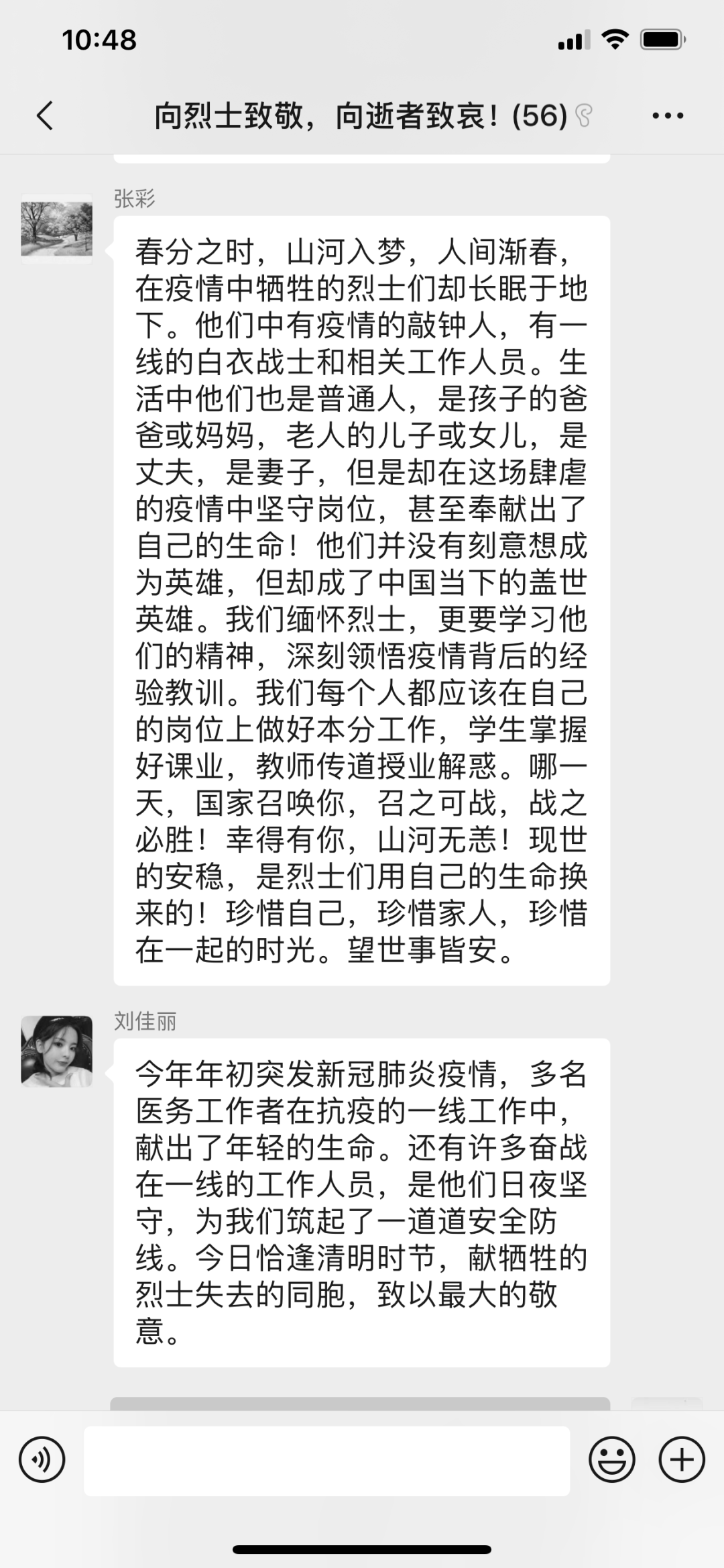 2020年清明,全国哀悼在抗击新冠肺炎疫情斗争中牺牲烈士和逝世同胞。学校青年教师班主任们开展云端祭奠,缅怀英烈,哀悼逝者。老师们纷纷表示将以自己的行动向英烈们学习,建功立业,爱国力行!
