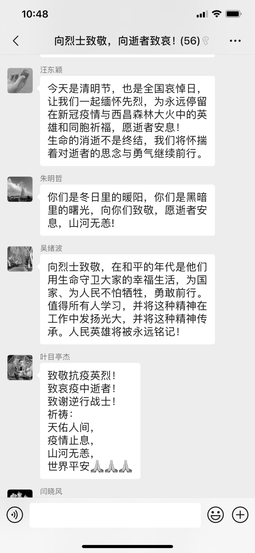 汪东颖 副教授 体育部:今天是清明节,也是全国哀悼日,让我们一起缅怀先烈,为永远停留在新冠疫情与西昌森林大火中的英雄和同胞祈福,愿逝者安息!生命的消逝不是终结,我们将怀揣着对逝者的思念与勇气继续前行!