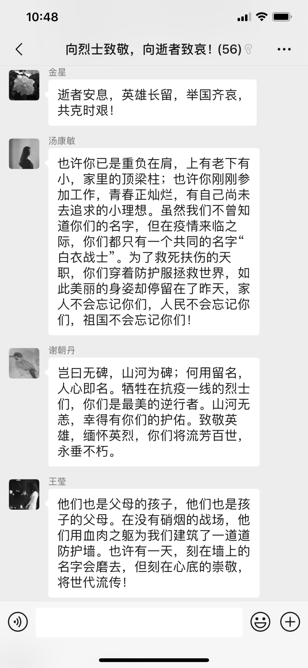 王瑛 讲师 图书馆:向烈士致敬,学习他们挺身而出,为国奉献的精神。国家需要他们这样的英雄,作为青年教师不仅自己要提高爱国情怀,更要利用好课程思政引导当代大学生们树立爱国意识,这些抗疫战场上的英雄给我们上了最好的一课,缅怀他们,向他们致敬!永远学习他们的精神!愿逝者安息,生者奋发,祖国昌盛!