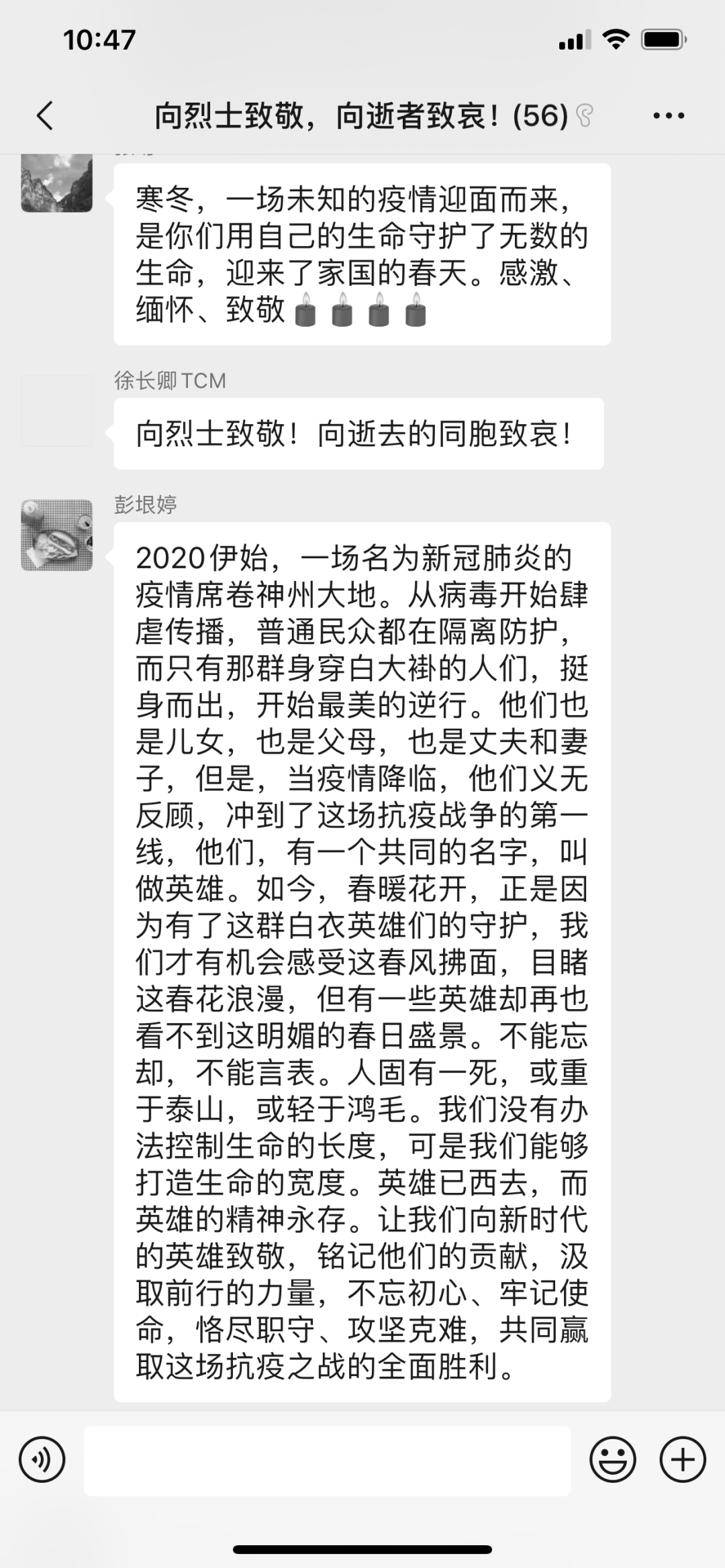 刘颖 副教授 中药学院:风清景明,慎终追远。为抗击新冠肺炎疫情斗争牺牲烈士和逝者同胞致哀!缅怀之际,致敬英雄用生命书写担当,致敬同胞以大爱负重前行!愿逝者安息,愿生者坚强,愿山河无恙,愿国泰民安。英雄精神生生不息,照亮生者逐梦征程。面向未来,我们中医药人继续为人民的健康而努力前行,告慰逝去的生命!