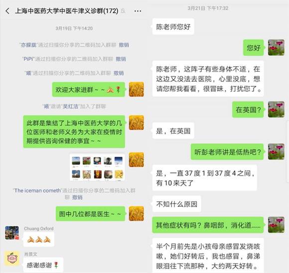 在疫情暴发的早期,该平台只是服务牛津地区的中医义诊平台,后期得到了越来越多其他地区华人的加入,成为面向全英华人的服务平台。医师服务团队对出现疾病困扰的华人进行一对一咨询,搭建义诊微信群,开展广泛的中医医疗宣传。建群当日,超过百人申请加入,其中包括来自牛津的华人教师、学生、访问学者、华侨;也吸引了来自伦敦、剑桥、卡迪夫、曼彻斯特等地的同胞以及其他在英的中医爱好者等。