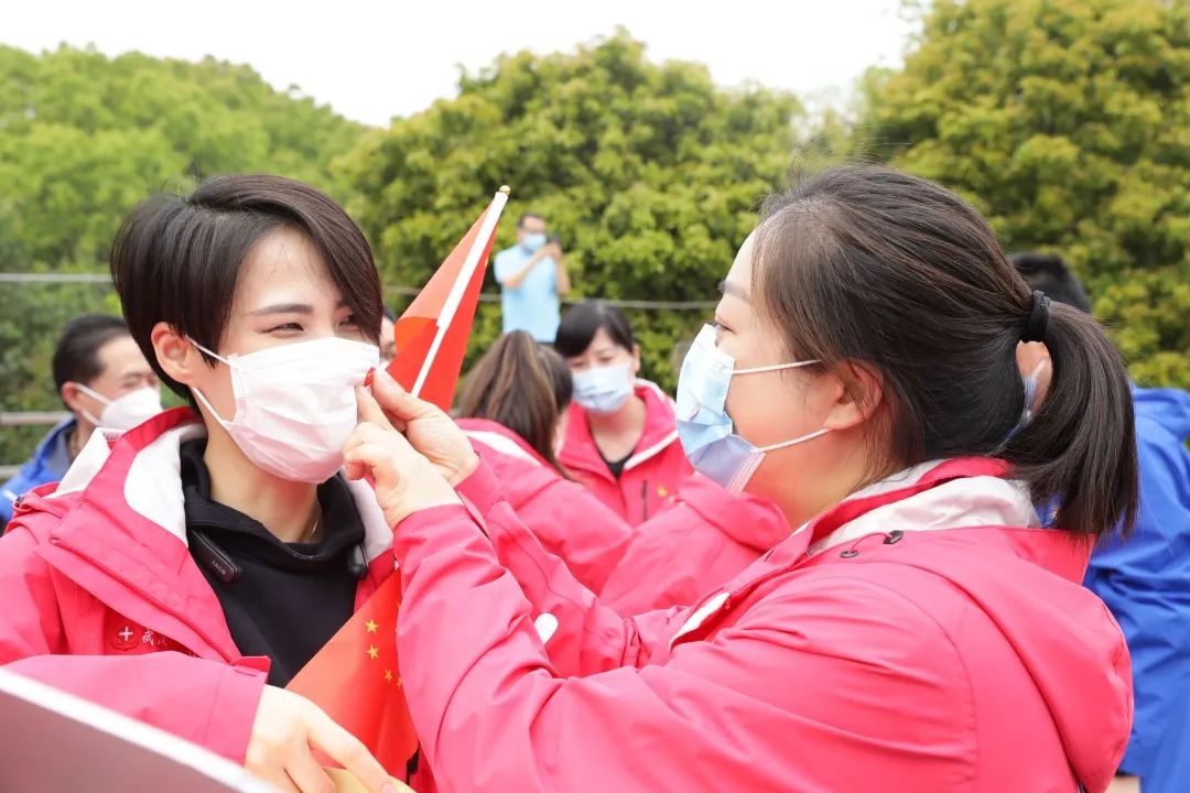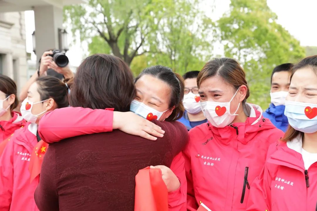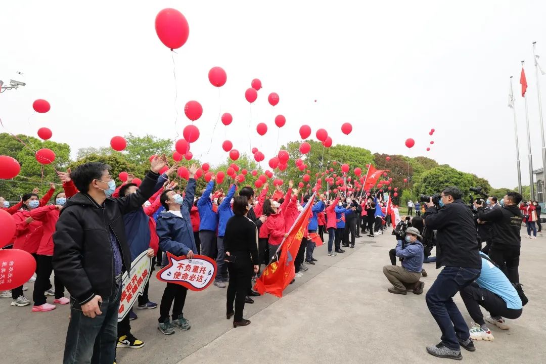 象征着希望、胜利、热情的红色气球齐齐飞向天空,明媚的暖阳下,援鄂队员们踏上回家之路。