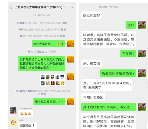在疫情爆发的早期,该平台只是服务牛津地区的中医义诊平台,后期得到了越来越多其他地区华人的加入,成为面向全英华人的服务平台。医师服务团队对出现疾病困扰的华人进行一对一咨询,搭建义诊微信群,开展广泛的中医医疗宣传。