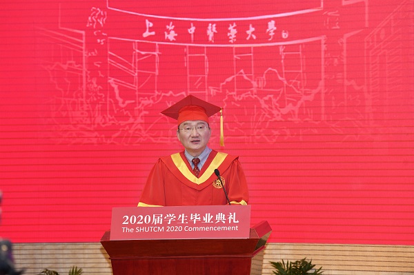 徐建光校长为全体毕业生带来“最后一堂大课”。他分享了《中国疫病史鉴》的记载:从西汉到清末,中国至少发生过321次大型瘟疫,中国人对于疫病历史之悠久、规律把握之准确、防治措施之先进,在古代世界医学史上是绝无仅有的。“可以说中医药的发展史也是中华民族的抗疫史。正是由于中医药的重要贡献,让我们从未出现过像西班牙大流感、欧洲黑死病、全球鼠疫那样导致数千万人死亡的悲剧。”他说,“面对疫情,中医从来不是‘慢郎中’。这次抗击新冠疫情中,全国范围有4000余名中医医务人员奔赴一线参与救治,可谓是中医药‘传承精华、守正创新’的一次鲜活实践。中医药人平时谦和、低调,但到了武汉一线尽显自信、拼搏,为取得抗击疫情阶段性胜利做出了上中医人的特殊贡献。”