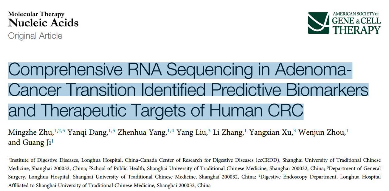 近日,bat365官网脾胃病研究所季光团队,与附属龙华医院胃肠外科许阳贤团队的合作研究,在结直肠癌炎癌转化机制和早期生物标志物发现上取得重要进展,研究发现为结直肠癌的早期诊断及治疗提供实验依据。研究成果分别在国际学术期刊Molecular Therapy-Nucleic Acids及Clinical and Translational Medicine上发表。