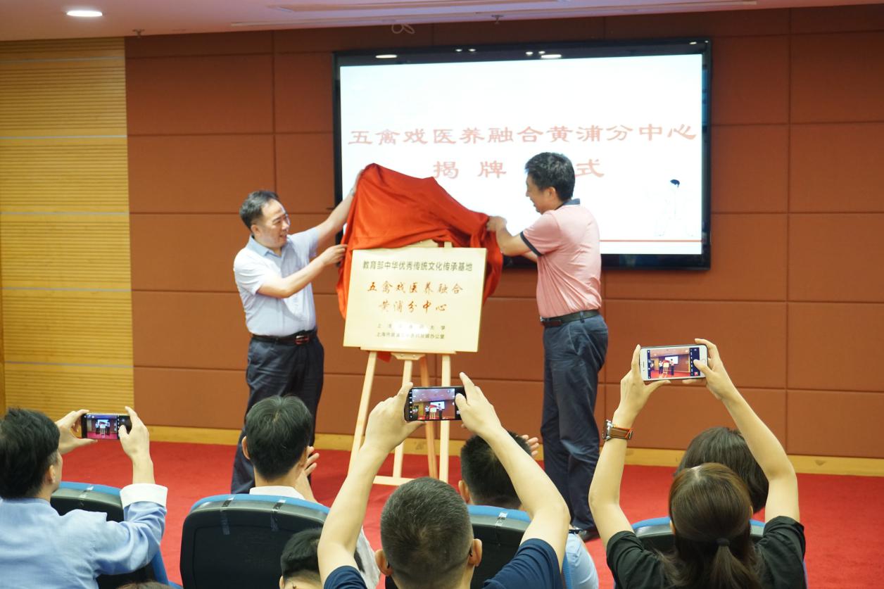 黄浦区卫生健康委中医药发展科科长候瑱分别为黄浦区中医养生功法队豫护分队、香山分队授旗。吴志坤和严谨贤共同为“五禽戏医养融合黄浦分中心”揭牌。