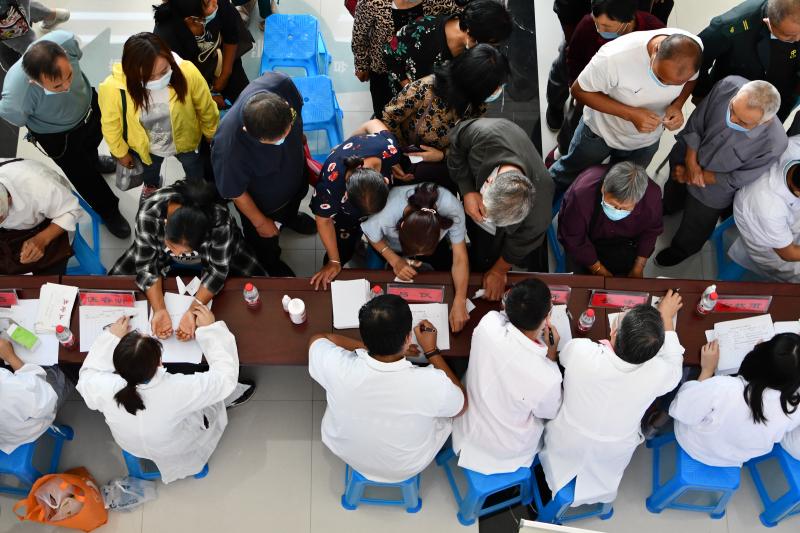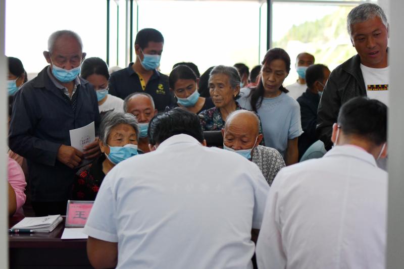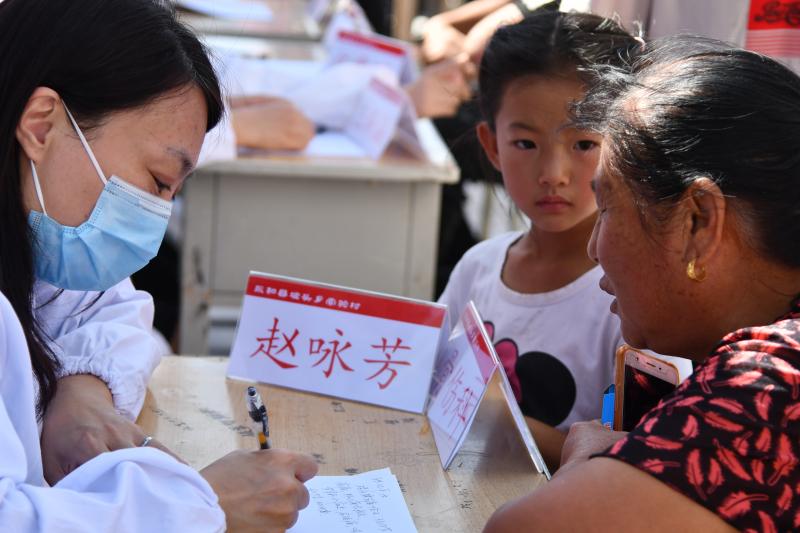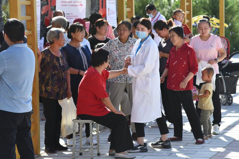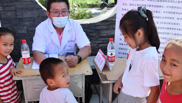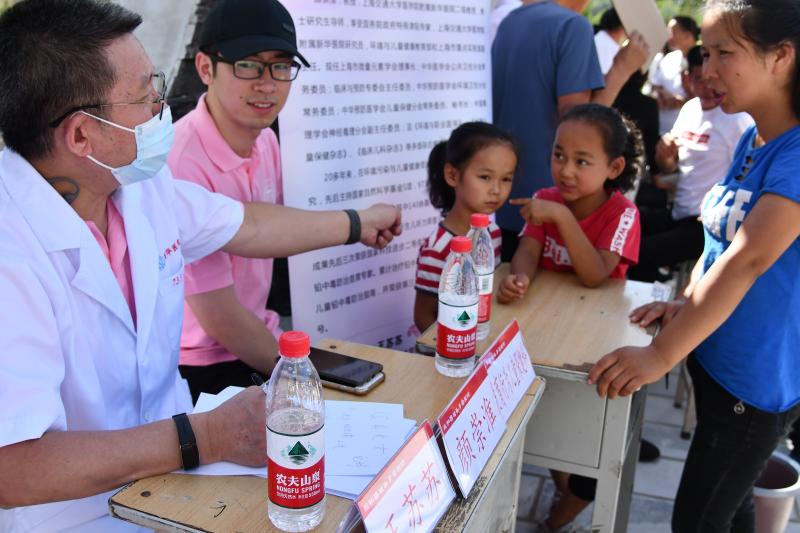 高坡环抱的索驼广场,几乎没有阴凉处。上海的主任医师们按呼吸与危重症科、骨关节外科、儿科、内分泌与代谢科、中医骨伤科、中医内科、针灸推拿等多个科室分工,将小桌椅一字排开,与来自十里八乡的满场乡亲们一一坐堂。没过多久,白衣之下的T恤都已汗湿,要时不时摘下口罩补水。