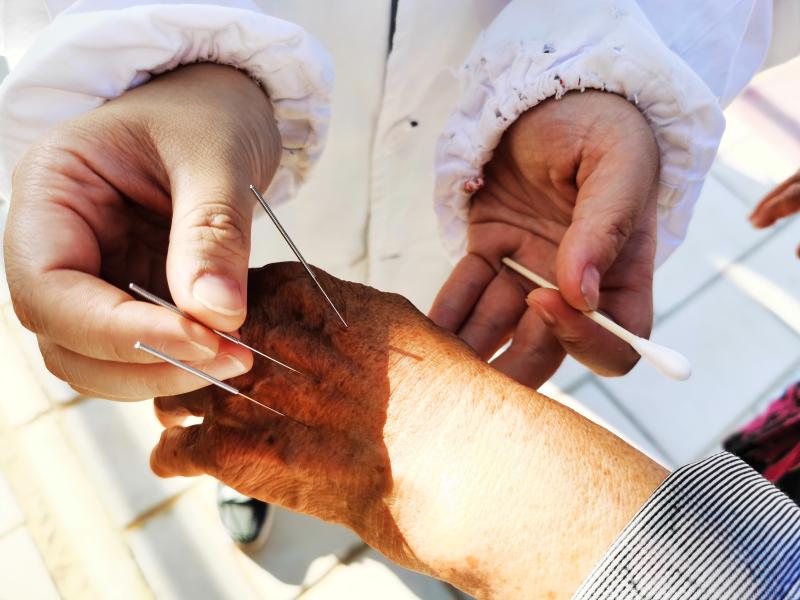 这时,中医大基础医学院2019级中西医结合基础学专业博士生伍睿昕所在的小组就成了排队最长的“窗口”。中风两年、半身不遂的老伯伯,坐着轮椅等针灸。伍睿昕和小伙伴在他脑门上、颌面部扎入六七针,不消20分钟,老人的手指能弯了。
