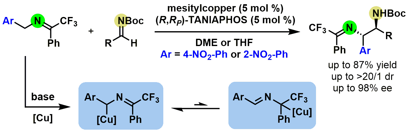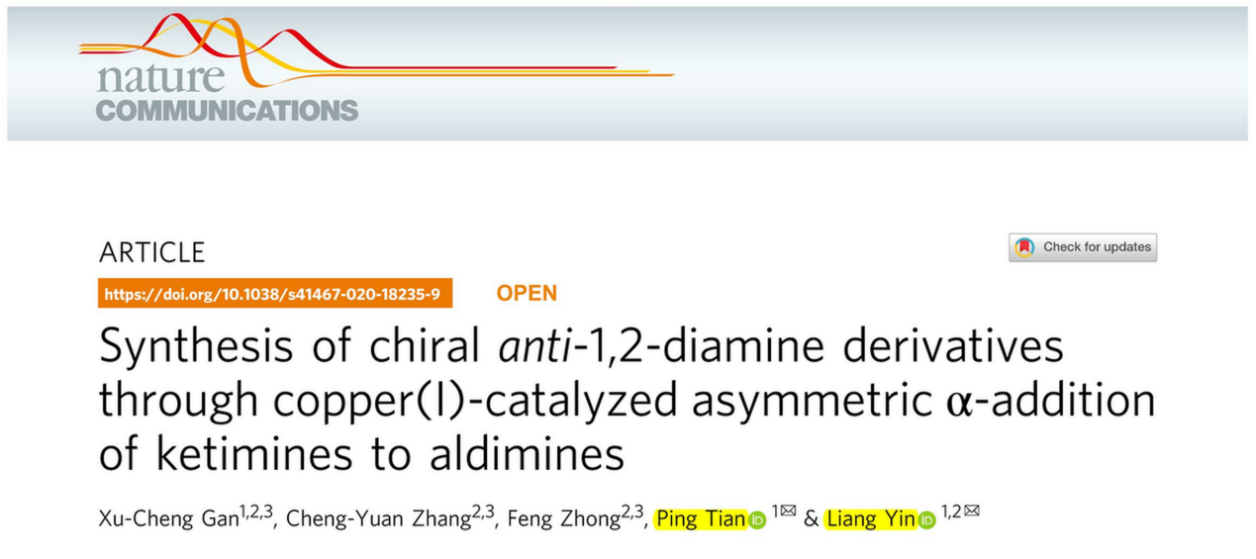 近日,bat365官网创新中药研究院林国强院士团队在《自然通讯》(Nature Communications)上发表研究论文Synthesis of chiral anti-1,2-diamine derivatives through copper(I)- catalyzed asymmetric α-addition of ketimines to aldimines,采用铜催化的亚胺的不对称分子间交叉偶联反应,高效且立体专一性地构建了天然产物中常见的手性二胺骨架。
