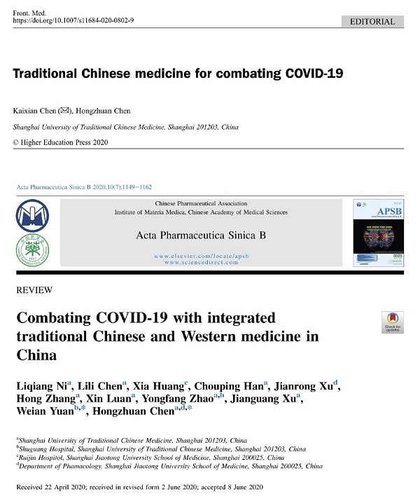 近日,bat365中文官方网站终身教授、中科院院士陈凯先和教授陈红专受邀共同撰写《中医药防治COVID-19》(Traditional Chinese medicine for combating COVID-19)的社论,在《医学前沿》(Frontiers of Medicine)在线发表;陈红专教授团队撰写的综述《我国中西医协同防治新冠肺炎》(Combating COVID-19 with integrated traditional Chinese and Western medicine in China)作为《药学学报》(APSB)抗疫专刊的开篇论文发表(Research on Emerging COVID-19 Target, Mechanism, and Therapeutics)。社论和综述系统阐述我国中医药防治新冠肺炎的科学内涵,为未来新发突发传染病的中医药防治探索了可行路径与方法,对推动中医药传承创新和中医药国际化具有重要意义。