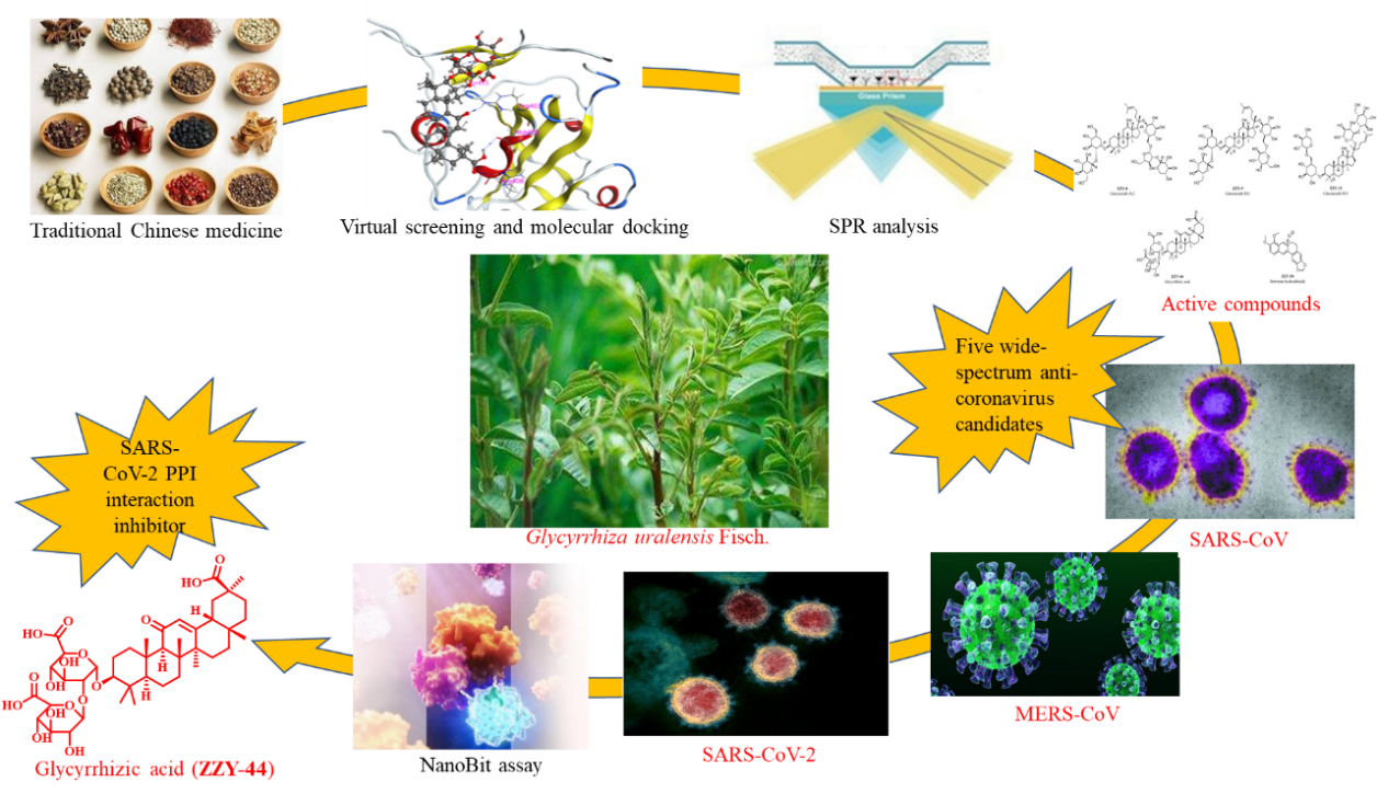 通过现代药理学实验手段,从有效中成药和方剂中寻找活性成分,并进一步揭示其作用机制,具有重要科学和应用价值。林国强及陈红专的教授团队揭示了从中药甘草中分离得到的活性成分——甘草酸,具有抗新冠病毒的作用机制。研究从临床抗新冠病毒有效的中药方剂出发,通过计算机辅助虚拟筛选,并运用SPR及NanoBit等生物技术及药理学研究,发现了甘草酸可以显著阻断新冠病毒棘突蛋白和人体内靶蛋白ACE2的结合,是抗新冠病毒活性的有效中药单体。