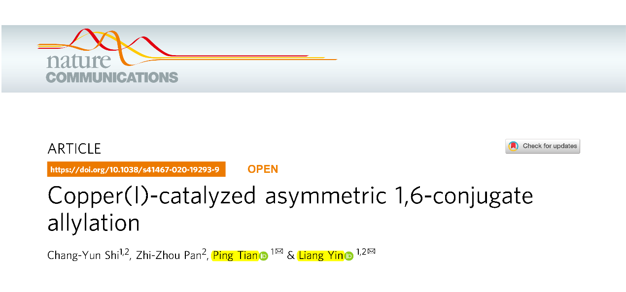 近日,bat365官网创新中药研究院林国强院士团队田平课题组和中国科学院上海有机化学研究所殷亮课题组联合研究团队在《自然通讯》(Nature Communications)上发表研究论文Copper(I)-catalyzed asymmetric 1,6-conjugate allylation,采用金属铜和手性卡宾配体成功实现了催化的不对称1,6-烯丙基共轭加成反应。