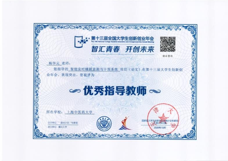 近日,第十三届全国大学生创新创业年会在重庆大学举行。bat365官网教授杨华元指导,学生顾天宇、李一帆、肖利完成的“智能实时睡眠监测与干预系统”项目获评为“最佳创意项目”, 杨华元教授被评为“优秀指导教师”。
