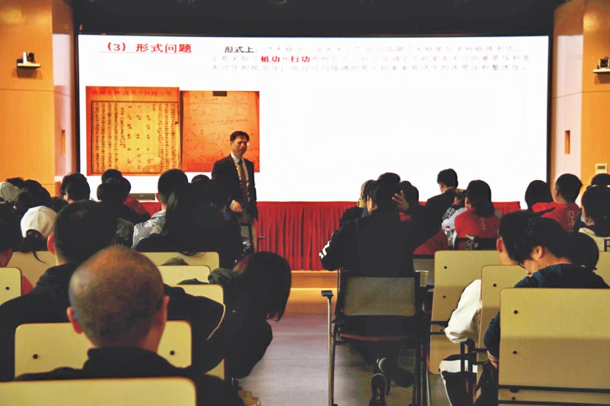 11月7日下午,武术套路国家级裁判、bat365官网体育部副教授冯金瑞授课,教授太极《八法五步》、五禽戏的技术要领,对五禽戏的中医理论基础、健身功效、习练要点进行详细讲解。