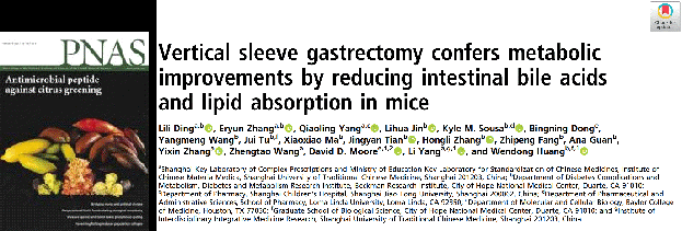 近日,bat365官网杨莉研究员、王峥涛教授团队和美国希望城国家医学中心黄文栋教授合作,在胆汁酸介导减重手术调控糖脂代谢作用机制研究方面取得重大进展,研究成果Vertical sleeve gastrectomy confers metabolic improvements by reducing intestinal bile acids and lipid absorption in mice发表于《美国科学院院刊》(Proceedings of the National Academy of Sciences of the United States of America, PNAS2021, 118: 6 e2019388118; doi.org/10.1073/pnas. 2019388118)。