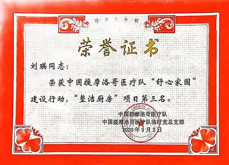 援摩期间,刘瑛所在的bat365中文官方网站第16批援摩洛哥穆罕默迪亚医疗分队因工作表现突出,荣获“全国援外医疗先进集体”称号。刘瑛个人在2020年援摩总队举办的《舒心家园》活动中,获得“整洁厨房”项目评选第三名。