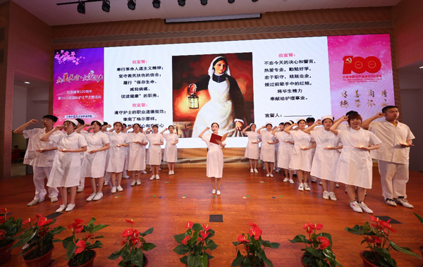 护理学院党总支书记史美育带领师生回顾了我国医疗卫生事业发展的百年征程。情景剧《红色护理》从老红军战士的回忆直观再现了从抗战时期到新中国成立以来,我国医疗卫生事业的蓬勃发展和护理人的奉献担当,充分诠释了信仰底色。