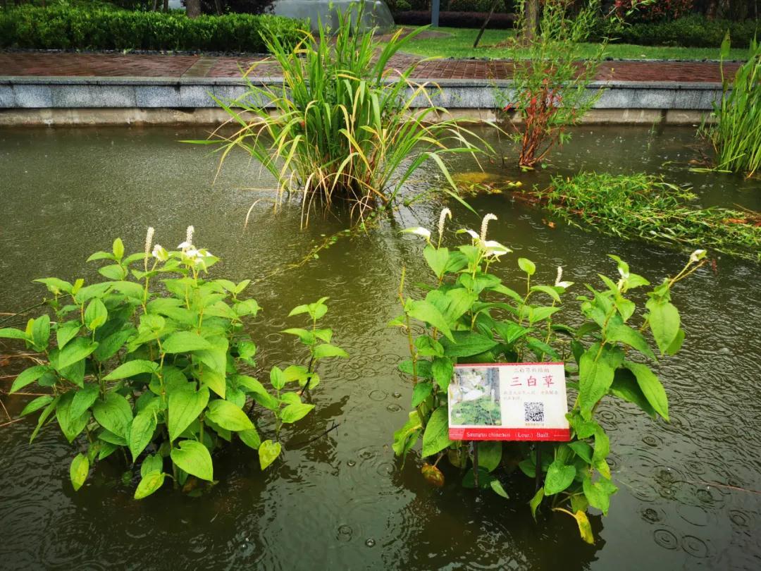 在水生园里,一种水生植物吸引了众人的目光:它开出的白色花朵酷似天鹅。微风吹拂,仿佛一群白天鹅在绿色湖面上游弋。走近一看,原来这么美的花名字是"三白草”:它的根茎和全草入药,可以清热解毒,利尿消肿。