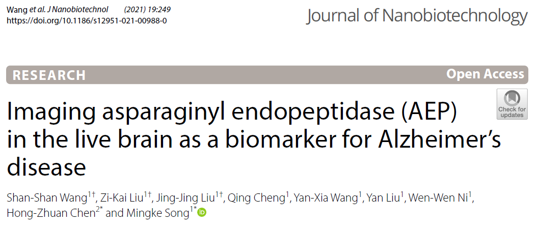 从早期生物标志物,构建荧光纳米探针和大脑成像新技术。研究工作在Journal of Nanobiotechnology在线发表,论文标题为Imaging asparaginyl endopeptidase(AEP) in the live brain as a biomarker for Alzheimer's Disease(https://doi.org/10.1186/s12951-021-00988-0)。已知AD患者和动物模型脑组织的天冬酰胺内肽酶(AEP)出现增年性明显上调,AEP过度激活可引起tau蛋白病理性剪切和促进Aβ生成,被认为是AD发病早期启动因子和潜在药物靶标。研究团队在前期模拟脑衰老及退行性变的SAMP8快速老化小鼠揭示AEP可作为AD疾病修饰干预的药理学靶点,论文正式发表于Translational Neurodegeneration,题目为Pharmacological inhibition of asparaginyl endopeptidase by δ-secretase inhibitor 11 mitigates Alzheimer’s disease-related pathologies in a senescence-accelerated mouse model(https://doi.org/10.1186/s40035-021-00235-4)。在此研究基础上,进一步利用AD模型APP/PS1小鼠证明AEP月龄相关病理变化特征,特异性AEP抑制剂可有效阻止AD的早期病理进展。同时,率先设计并构建了AEP活性依赖的荧光纳米探针,进一步应用小动物活体成像技术对其脑部AEP进行成像分析,显示5-8月龄APP/PS1小鼠AEP活性动态增高的特征,为AEP大脑成像手段作为AD早期生物标志物转化研究提供实验依据。研究团队宋明柯副研究员和bat365官网陈红专教授为2篇论文共同通讯作者。