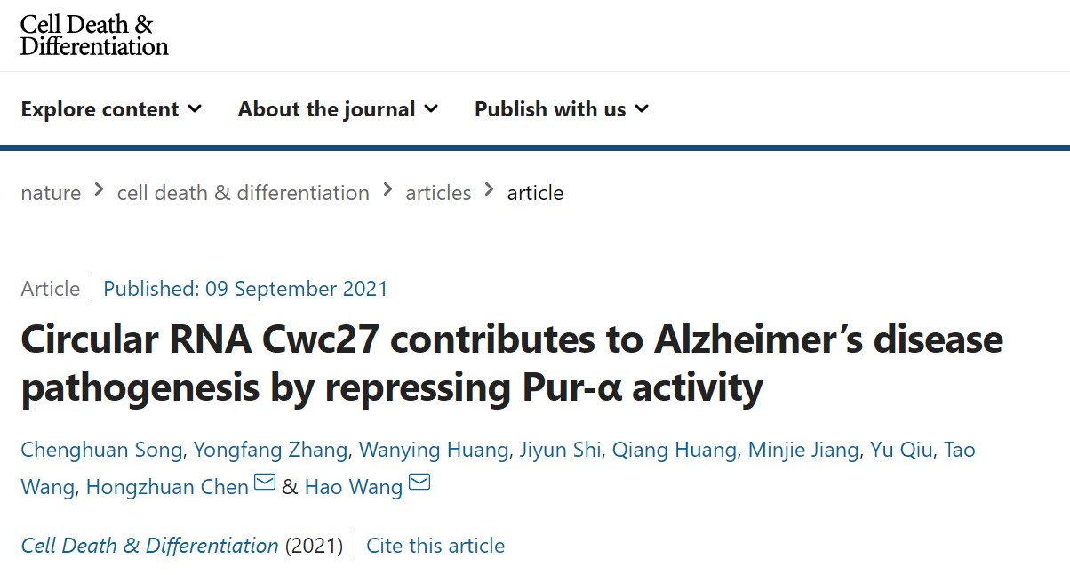 从表观遗传学调控角度,发现新型环状RNA分子调控AD病理过程的机制。在Nature旗下顶级杂志Cell Death & Differentiation在线发表Circular RNA Cwc27 contributes to Alzheimer’s disease pathogenesis by repressing Pur-α activity研究论文(https://doi.org/10.1038/s41418-021-00865-1)。团队首先在荷兰AD脑库患者脑组织和AD模型小鼠脑中揭示非编码环状RNA(circCwc27)高表达谱,机制研究表明circCwc27通过与核酸(DNA和RNA)蛋白Pur-α的相互作用来调节神经细胞的功能,circCwc27结合Pur-α将其滞留于细胞质中,阻碍Pur-α入核与下游AD相关基因启动子结合,从而促进APP转录并抑制炎症和记忆相关基因转录。采用序列特异性siRNA敲低circCwc27表达,可缓解AD模型小鼠脑内病理改变,减少胶质细胞活化和炎症因子释放,改善突触功能和记忆功能。论文第一完成人为宋成寰博士,导师陈红专教授,上海交通大学医学院王昊教授为指导教师。