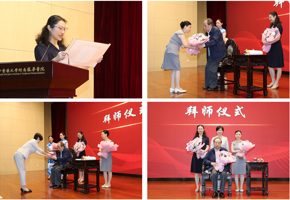 随后,现场举行拜师仪式。沈琳作为学生代表宣读拜师贴,三位学生沈琳、张玮、刘萍逐一向严世芸教授递交拜师贴、敬茶、献花并鞠躬行礼。