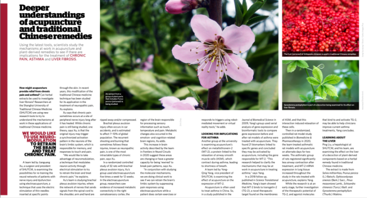 焦点关注特刊报道以“深度理解针灸与传统中医疗法”为主题,重点介绍了学校研究团队使用现代技术研究针灸和传统中医药疗法对治疗慢性疼痛、哮喘、肝纤维化以及提高中药标准等方面的研究成果。