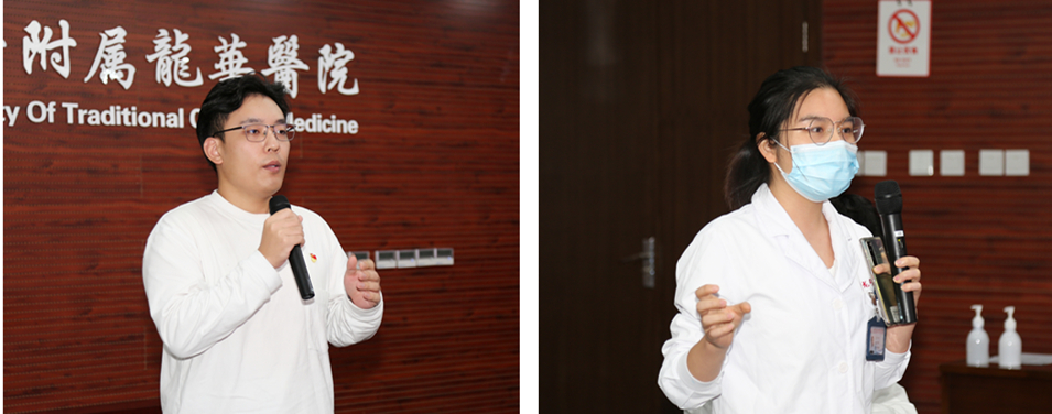 朱惠蓉和郑锦先后作总结发言。朱惠蓉表示,龙华医院学生第一党支部基础工作扎实,资源整合较好,顶层设计有效,积极落实“七个有力”建设要求,落实立德树人根本任务;党支部要将政治学习和理论学习放在首位,做好理想信念教育,同时要擅于倾听学生声音,让学生在支部活动中唱主角,有效发挥支委的力量,并将党支部建设和中医药专业特点密切结合起来,以支部发展“枝繁叶茂”带动中医药人才培养;同时做好顶层设计,带着问题做研究,善于总结凝练,充分发挥党支部的标杆引领作用,加强党支部长效机制建设。郑锦对支部取得的成绩给予肯定,认为支部应认清党支部、党员与学生群众的关系,找到政治引领与中医育才之间的结合点,以研究生党员标兵的标准培养学生,为国家培养更多政治素质过硬、专业能力扎实的接班人,同时希望党员都能谨记习近平总书记“七一”重要讲话精神,发挥一个党员就是一面旗帜的作用,以此次创建为契机,勇往直前,奋发图强,真正做到“请党放心、强国有我”。她鼓励学生党员发挥主人翁意识,秉承“传承精华,守正创新”的理念,做一个又红又专的中医人,为实现中华民族伟大复兴奉献青春力量。