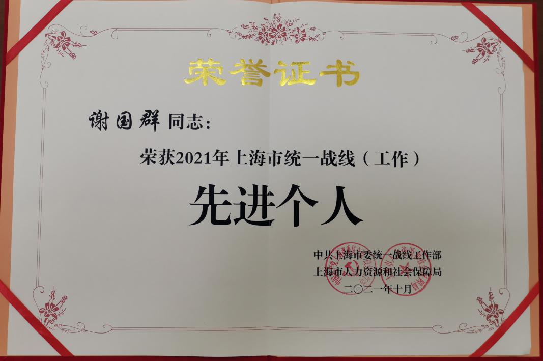 台盟盟员、bat365官网谢国群获评为2021年上海市统一战线(工作)先进个人