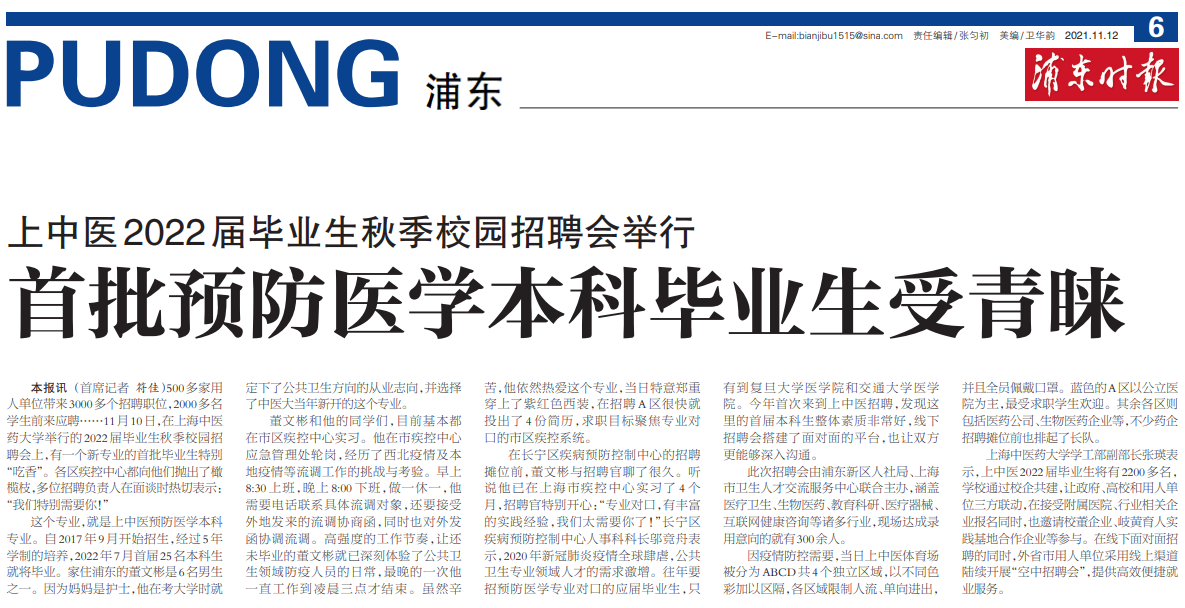浦东时报:上中医2022届毕业生秋季校园招聘会举行 首批预防医学本科毕业生受青睐