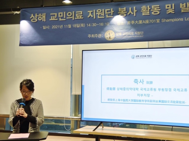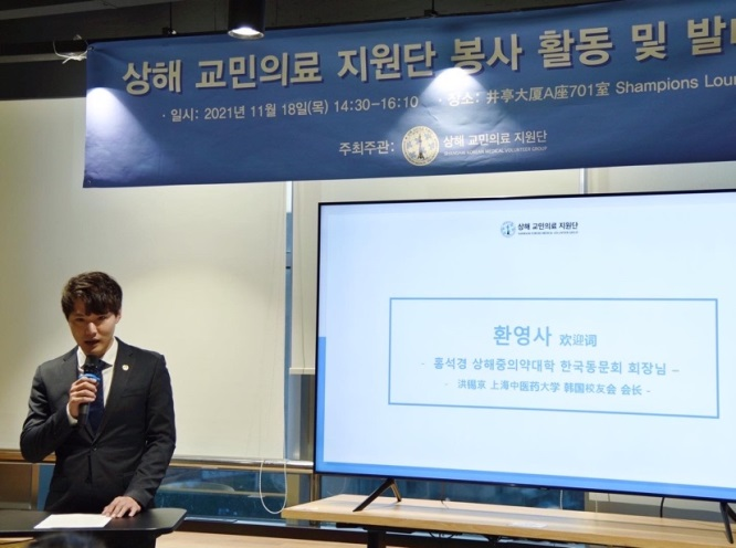 11月18日,bat365中文官方网站韩国校友会举办“上海韩国侨民医疗援助团”启动仪式。bat365官网对外联络处处长郑林贇、国际教育学院副院长兼国际交流处副处长傅勤慧、韩国校友会会长洪锡京,上海韩国学校校长田炳碩、上海韩国国际物流协议会会长卞哲、女性经济人会会长朴琓信、韩国宪法性机构总统直属咨询委员会上海协议会干事姜同赫、兴士团上海支部团长裴鍗珍、OKTA世界韩人贸易协会首席副会长张泰国、在上海韩国留学生总联盟会主席金成俊、东远金枪鱼法人代表等出席。