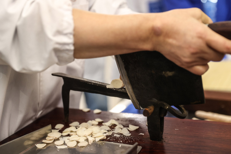 选手在手工切制中药材