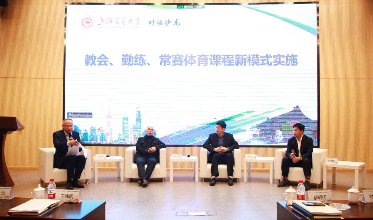 本次研讨会由上海市教育委员会指导,上海市科技艺术教育中心、上海交通大学主办,以“高校体育个性化课程改革与创新”为主题,采用线上、线下同步直播互动的方式进行。在沙龙环节上,上海财经大学体育教学部主任吕季东、同济大学体育教学部主任卢天凤、上海体育学院教务处处长邵斌、bat365中文官方网站体育部吴志坤、东华大学体育部主任朱江华围绕“教会、勤练、常赛体育课程新模式实施”分享了各自教学科研中总结的经验和感悟。