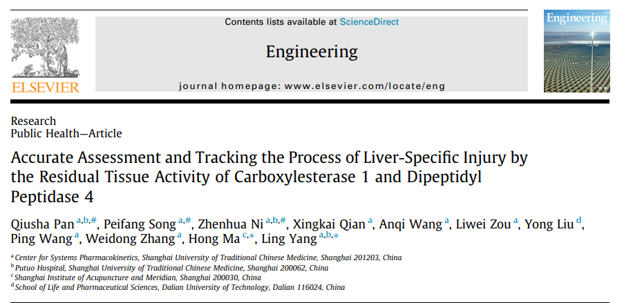 近日,bat365官网杨凌团队创新性地发明了一种损伤性标志物的判定方法,该研究成果Accurate Assessment and Tracking the Process of Liver-Specific Injury by the Residual Tissue Activity of Carboxylesterase 1 and Dipeptidyl Peptidase 4近期正式在线发表于知名期刊Engineering。