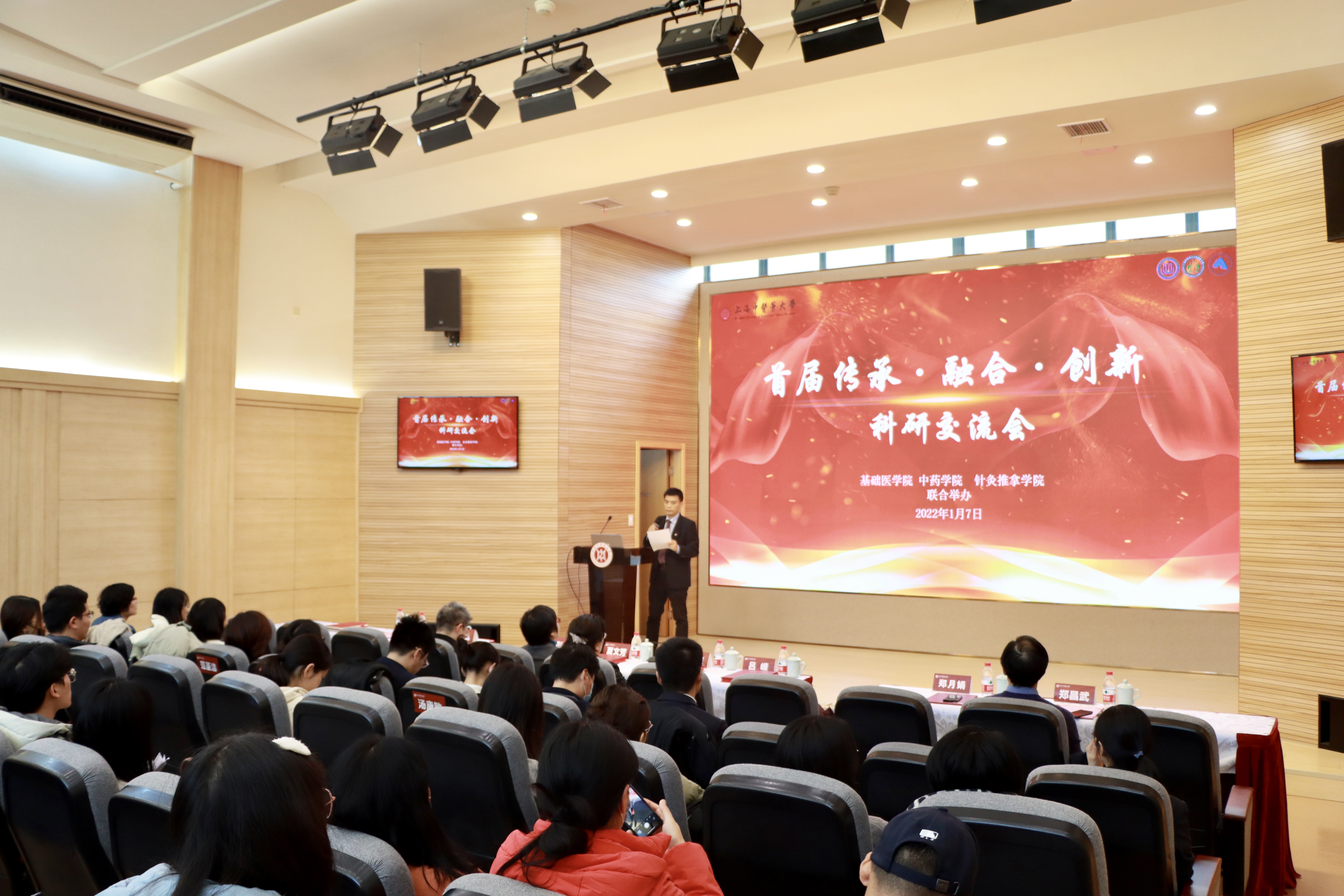 为更好促进学科交融和合作,传承发展中医药事业,由基础医学院、中药学院和针灸推拿学院联合策划,首届“传承·融合·创新”科研交流会于1月7日下午在bat365官网全球合作伙伴中心报告厅举办。基础医学院党委书记夏文芳、院长吕嵘、副院长郑月娟,中药学院党委书记沈岚、院长张彤、副院长郑昌武,针灸推拿学院党总支书记陈秋生、院长赵琛和多个学院的师生共同出席会议。会议由郑月娟主持。