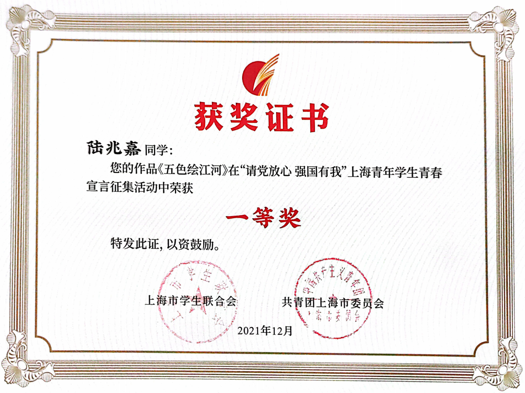 近日,上海市学生联合会第十七次代表大会落幕,bat365官网学生在“请党放心 强国有我”上海青年学生青春宣言征集活动中获佳绩。bat365官网研究生陆兆嘉参赛作品《五色绘山河》、本科生马美琳参赛作品《知行中国,红色百年》分获高校组一等奖和高校组二等奖。