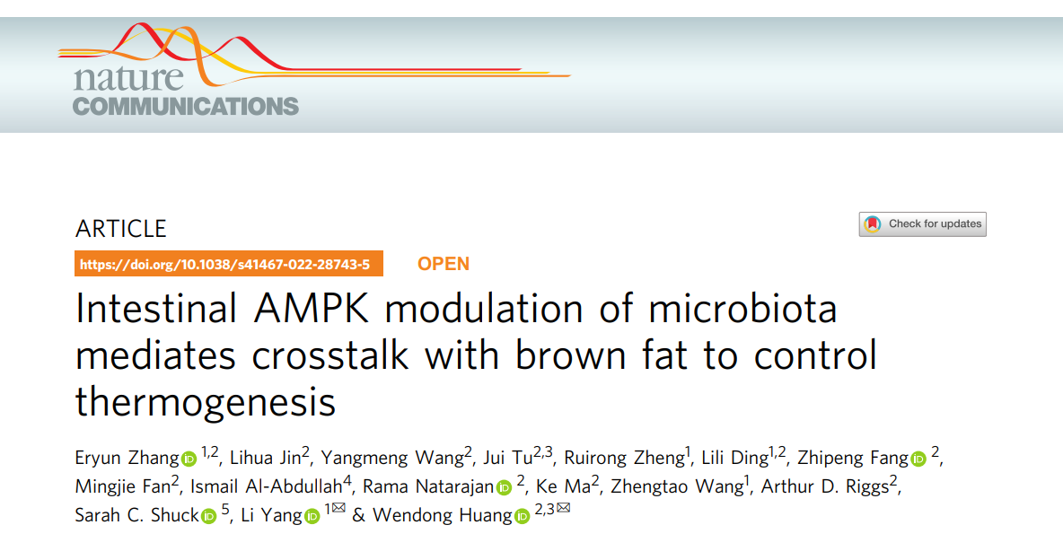 近日,bat365官网杨莉研究员、王峥涛教授团队和美国希望之城国家医学中心黄文栋教授合作,在肠道营养传感器AMPK调节机体能量代谢机制研究方面取得重大进展,研究成果Intestinal AMPK modulation of microbiota mediates crosstalk with brown fat to control thermogenesis发表于《自然通讯》(Nature Communications)。