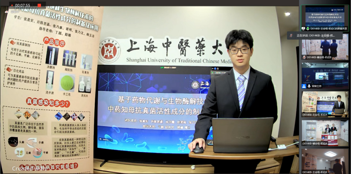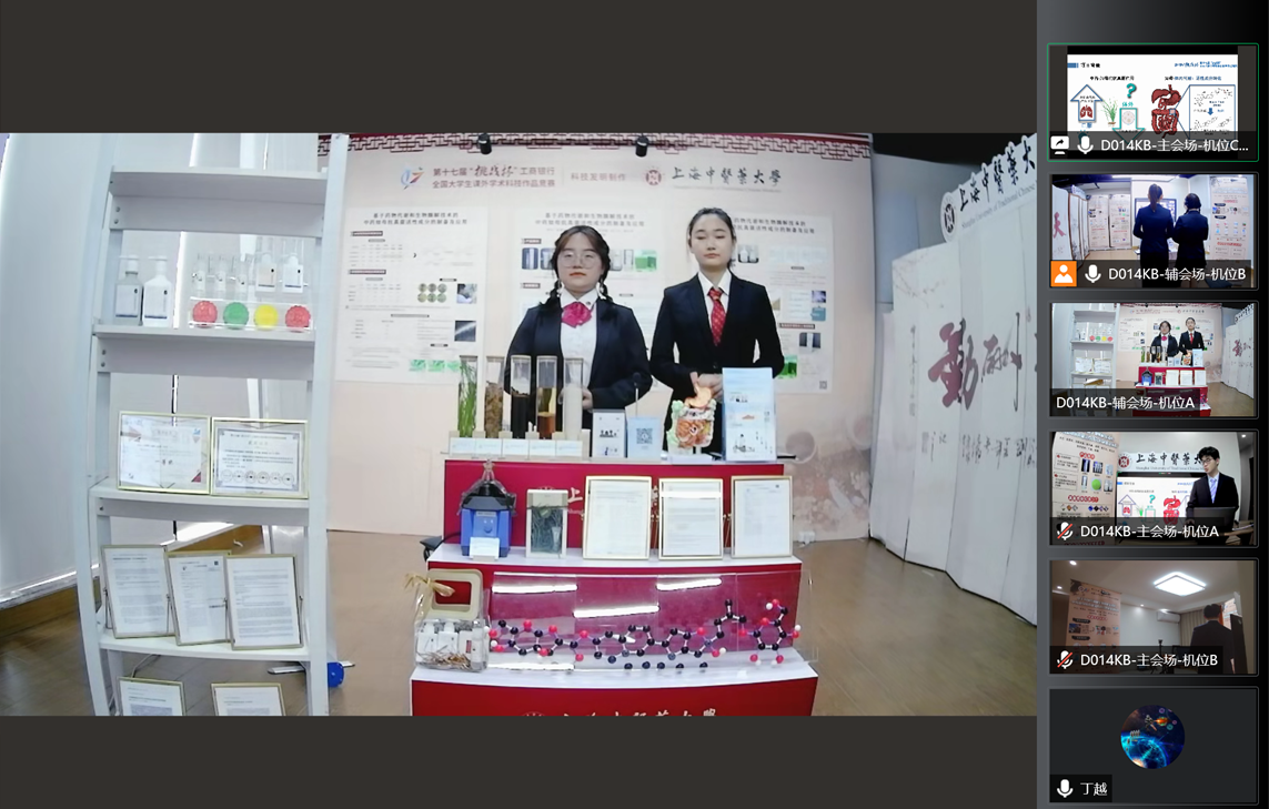 此次“挑战杯”决赛由于受到新冠疫情影响,以线上展示和问辩的形式进行。参赛团队在答辩现场精心布展,将团队前期的基础研究、产品研发、转化和应用成果进行多维度充分展示。