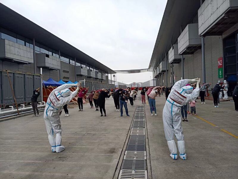 新国际博览中心方舱医院内,医生带领患者习练强身功