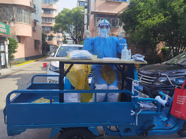 图说:彭浦镇社区卫生服务中心护士骆文婷在采样结束后,带着医废穿梭在街头 采访对象供图