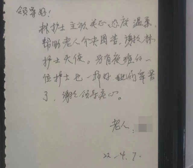 “林护士主动关心、态度温柔,帮助老人解决困苦,谢谢林护士天使。另有夜班的一位护士也一样好,她们辛苦了。”这是90岁的王奶奶(化名)出院前,留下的一张小纸条。仅仅数十个字,却是王奶奶用颤抖的手一笔一画写下来的,字里行间是这位90岁高龄老人对90后护士的谢意。