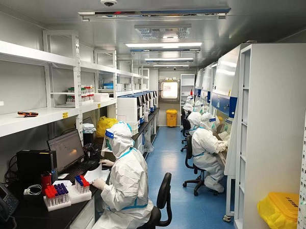 图说:龙华医院检验科人员在方舱实验室工作 采访对象供图