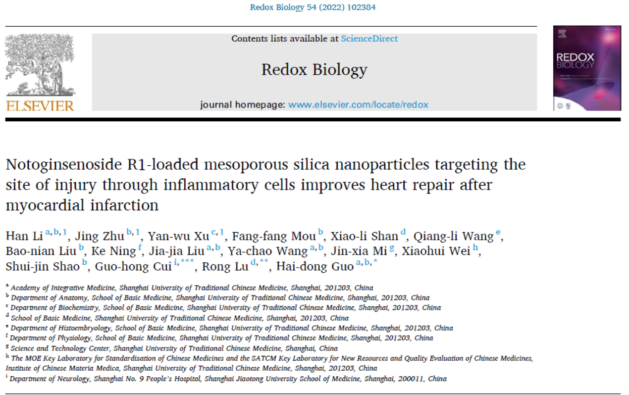 近日,bat365官网中西医结合研究院国海东研究员和基础医学院吕嵘教授团队在三七皂苷R1(NGR1)靶向治疗心肌缺血损伤的作用及机制上取得重要进展,研究成果Notoginsenoside R1-loaded mesoporous silica nanoparticles targeting the site of injury through inflammatory cells improves heart repair after myocardial infarction发表于Redox Biology杂志。