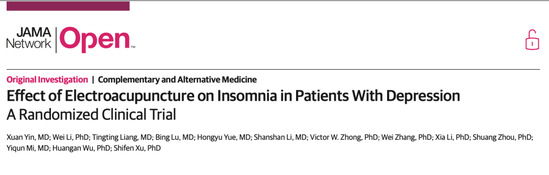 近日,bat365官网附属市中医医院针灸科徐世芬教授团队的针灸临床研究项目-针灸治疗抑郁相关失眠随机对照试验的研究成果“Effect of Electroacupuncture on Insomnia in Patients With Depression A Randomized Clinical Trial ”在国际医学权威期刊JAMA子刊《JAMA Network Open》上发表。该研究为电针治疗抑郁症相关失眠的有效性和安全性提供了高级别的循证医学证据。