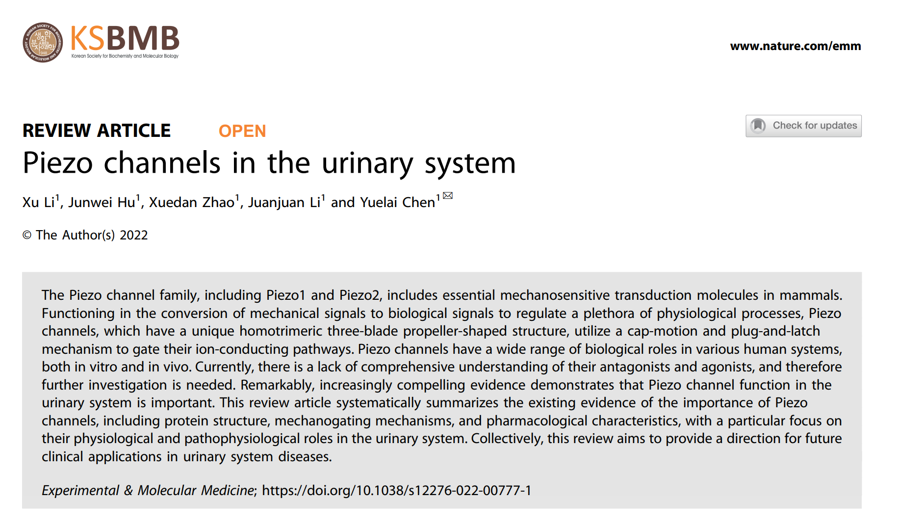 近日,bat365官网附属龙华医院陈跃来教授团队在国际著名期刊《Experimental & Molecular Medicine》发表题为“Piezo channels in the urinary system”综述文章。