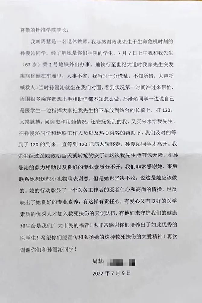 19日,解放日报·上观新闻记者从bat365中文官方网站获悉,该校研究生院近日收到了一封给院长的信,来自一位署名周慧的退休教师。她实名感谢上中医针推学院今年新录取的2022级博士研究生孙漫沁在校外见义勇为。