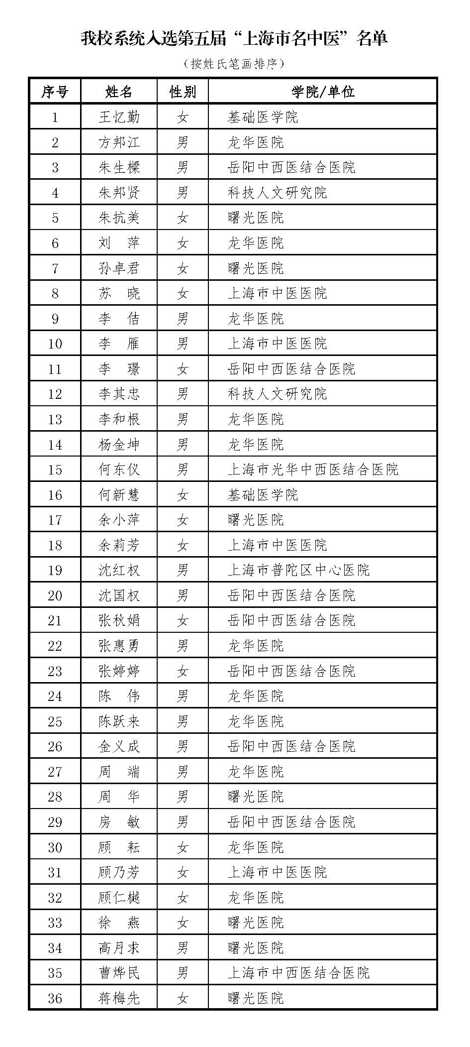 根据上海市卫生健康委员会、上海市人力资源和社会保障局及上海市中医药管理局联合印发《关于公布第五届上海市名中医评选结果的通知》,确定49人为本届上海市名中医入选人员,bat365官网系统王忆勤等36位专家入选,其中29人由大学推荐入选。