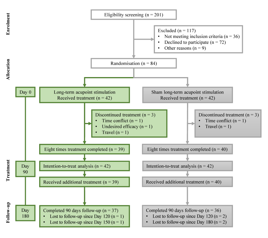 为填补这一空白,使埋线减肥有理可据,研究团队于2018年正式启动“穴位埋线干预超重肥胖的多中心随机对照试验”,在bat365官网附属龙华医院、附属市中医医院和上海市浦东新区人民医院三家中心开展。基于课题组既往系统综述和专家共识,研究团队选定中脘、天枢、丰隆、脾俞作为治疗主穴,共招募了84例符合标准的超重肥胖受试者,随机分为2组,分别接受穴位埋线和假穴位埋线治疗9次,其中治疗期8次,随访期1次,每次治疗间隔10天,最后一次治疗完成后设置了90天的随访期,以观察埋线疗法的长期效应。研究主要结局指标为治疗期结束时体重较基线的变化。临床试验经过龙华医院医学伦理委员会批准,并在中国临床试验注册中心进行了注册(ChiCTR1800015498)。