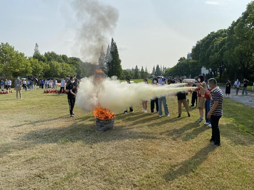 消防演练前,保卫处消防专员金治佳和马国华介绍火灾预防、火灾初起处置等消防知识,以及灭火器的使用方法和灭火技巧,并现场演示如何使用灭火器。